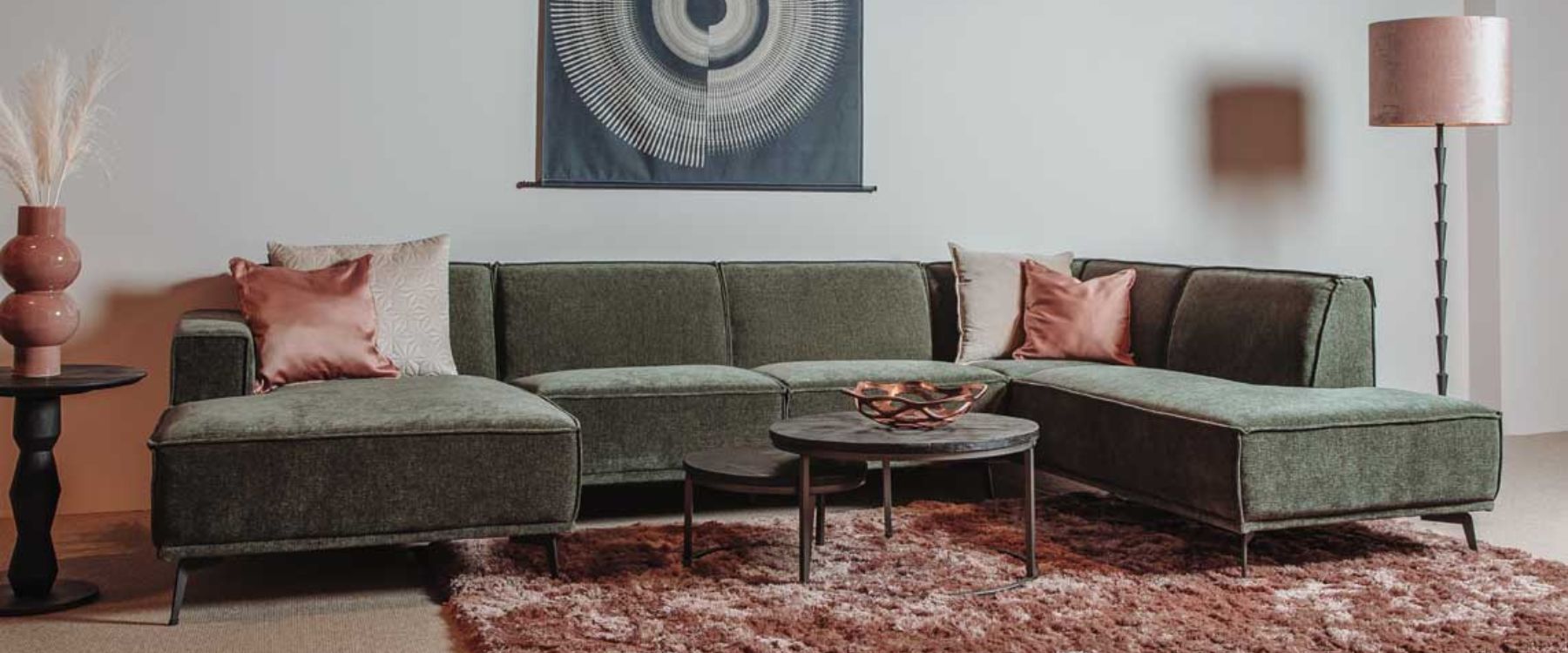 Waar minimalisme rust brengt, zorgt deze trend juist voor leven en energie. Warme tinten zoals aubergine, roodbruin en poederroze worden gecombineerd met zachte texturen en ronde, uitnodigende vormen. Denk aan grote vloerkleden, knusse banken en velvet stoffen die een speelse en vriendelijke sfeer creëren. Deze stijl durft contrast en kleur te omarmen en geeft je interieur direct persoonlijkheid en karakter.