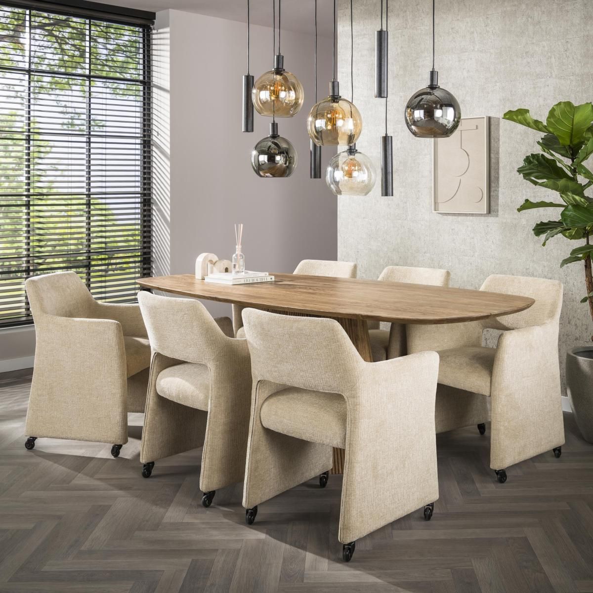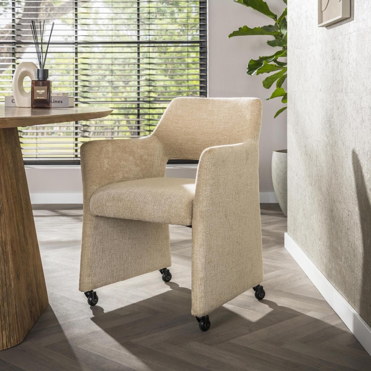 Combineer deze armstoel met een robuuste houten eettafel of een minimalistisch bureau voor een harmonieuze look. De Arianna armstoel - met wieltjes - zand voegt een vleugje elegantie toe aan iedere ruimte en is perfect voor wie houdt van comfort zonder in te leveren op stijl.