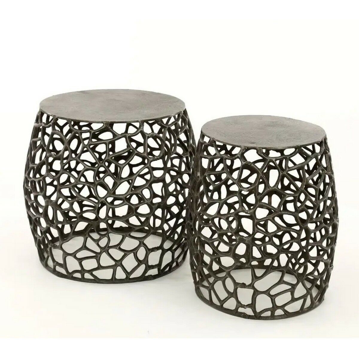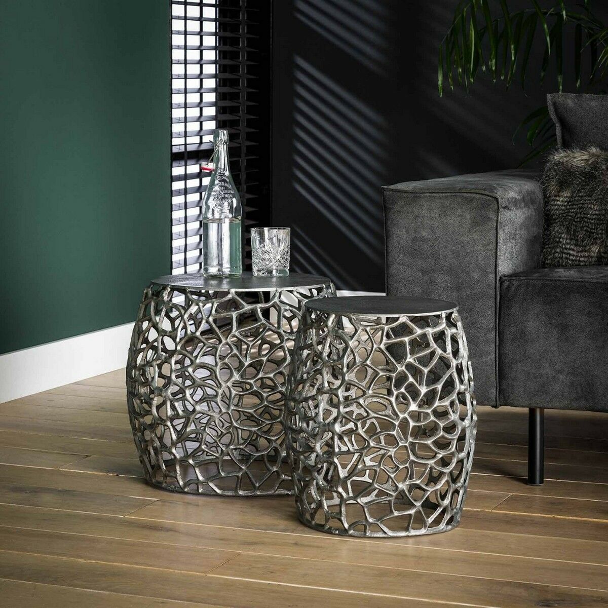 Een moderne, industriële en stijlvolle set van twee bijzettafels: dat is de Candice bijzettafelset! Beide tafeltjes zijn voorzien van een zandgegoten dun rond tafelblad van zwart nikkel. Het onderstel heeft een open ontwerp gekregen en is uitgevoerd in aluminium. Dankzij het sierlijke patroon van dit onderstel, krijgen de tafeltjes een speelse uitstraling. Plaats deze tafeltjes bij elkaar of juist apart van elkaar en geniet van hun prachtige ontwerp. Deze bijzettafelset is ook verkrijgbaar in een grotere variant: Berrit. Afmetingen Kleine tafel (BxDxH): 35x35x42 cm Grote tafel (BxDxH): 45x45x42 cm