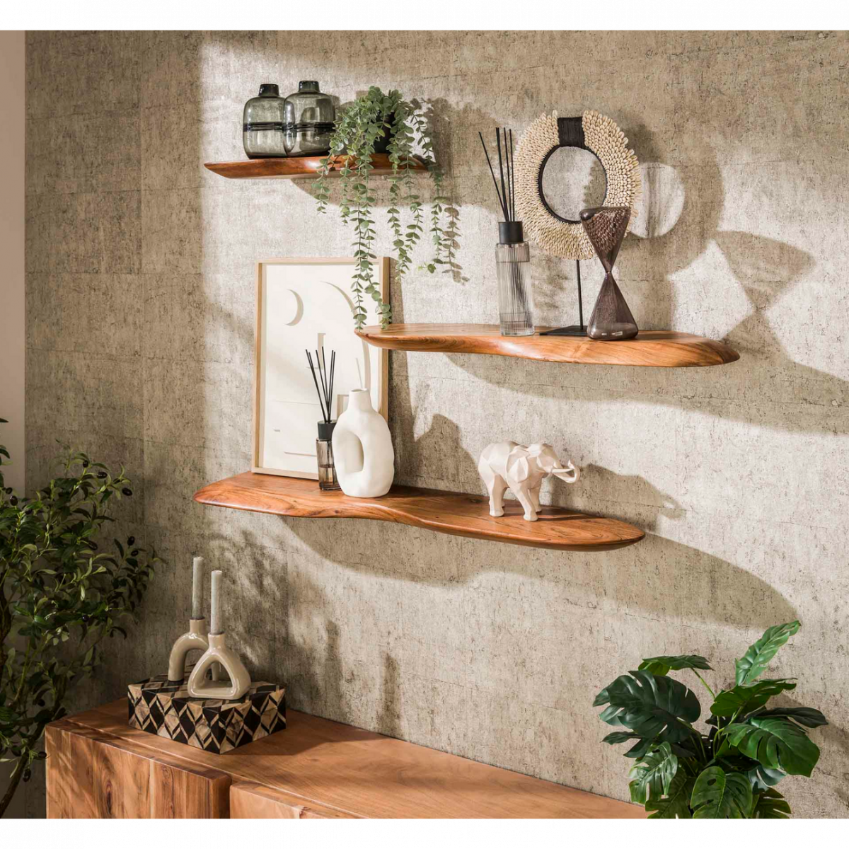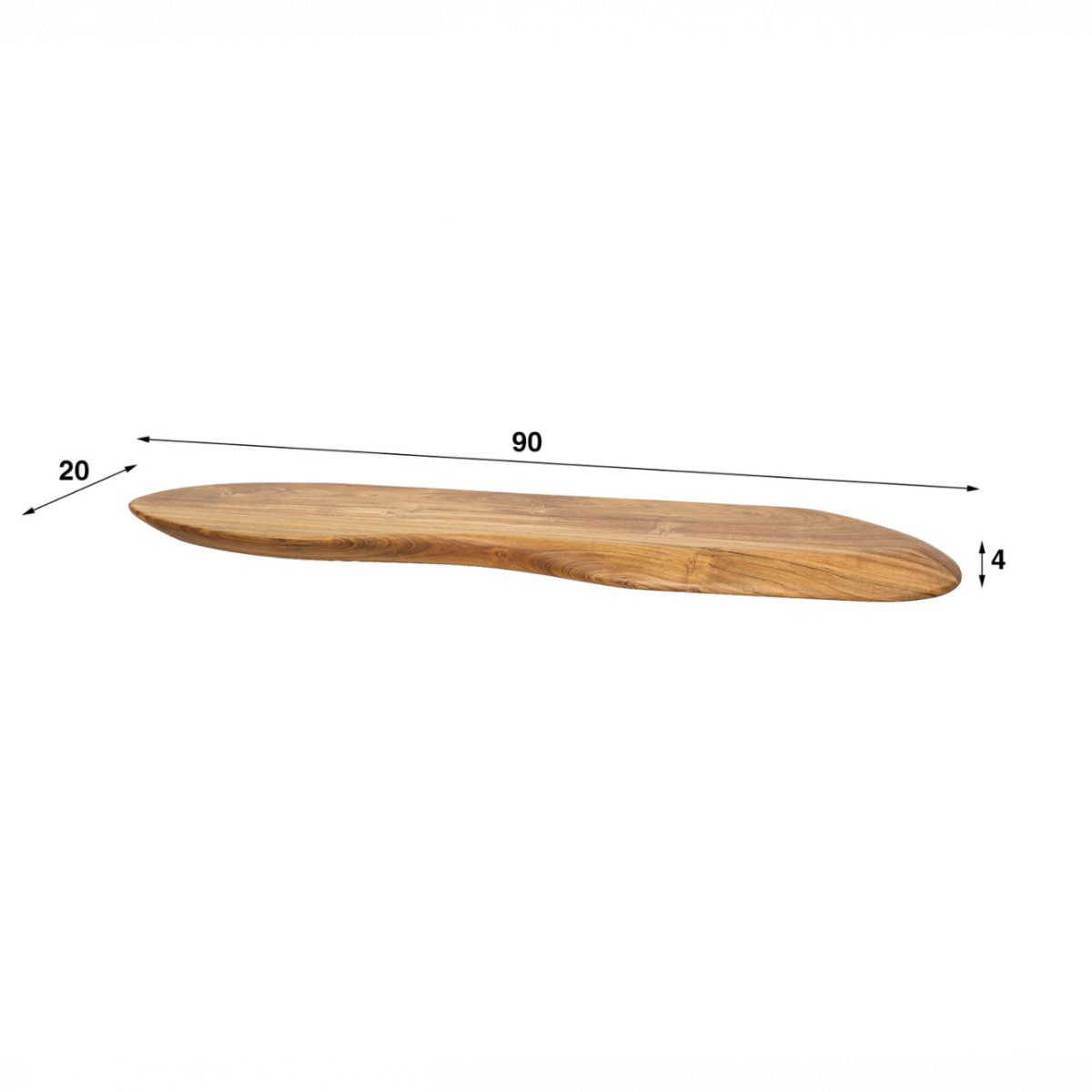 Deze organische wandplank is 90 centimeter lang en uitgevoerd in massief natural acaciahout. De plank is afgewerkt met een blanke lak voor een natuurlijke uitstraling.