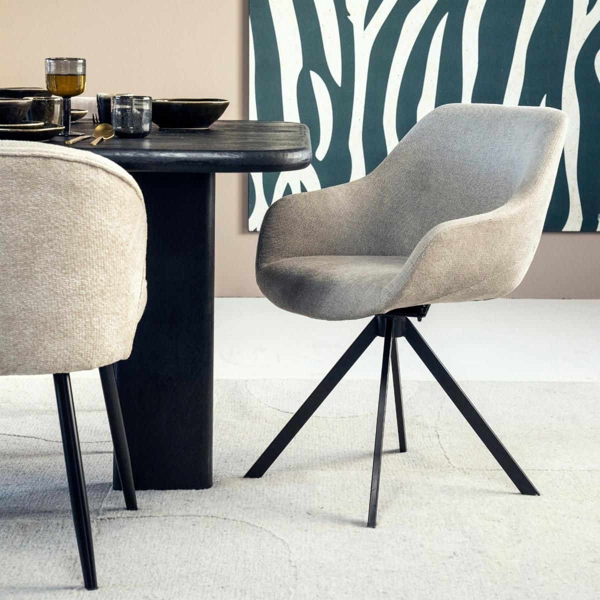 De Mamé draaibare eetkamerstoel belichaamt niet alleen stijlvol design maar biedt ook functionaliteit met zijn draaifunctie. Of je nu kiest voor de warme uitstraling van bruin, de ingetogen elegantie van grijs, of de neutrale charme van beige, deze stoel voegt een eigentijds element toe aan jouw eetkamer.