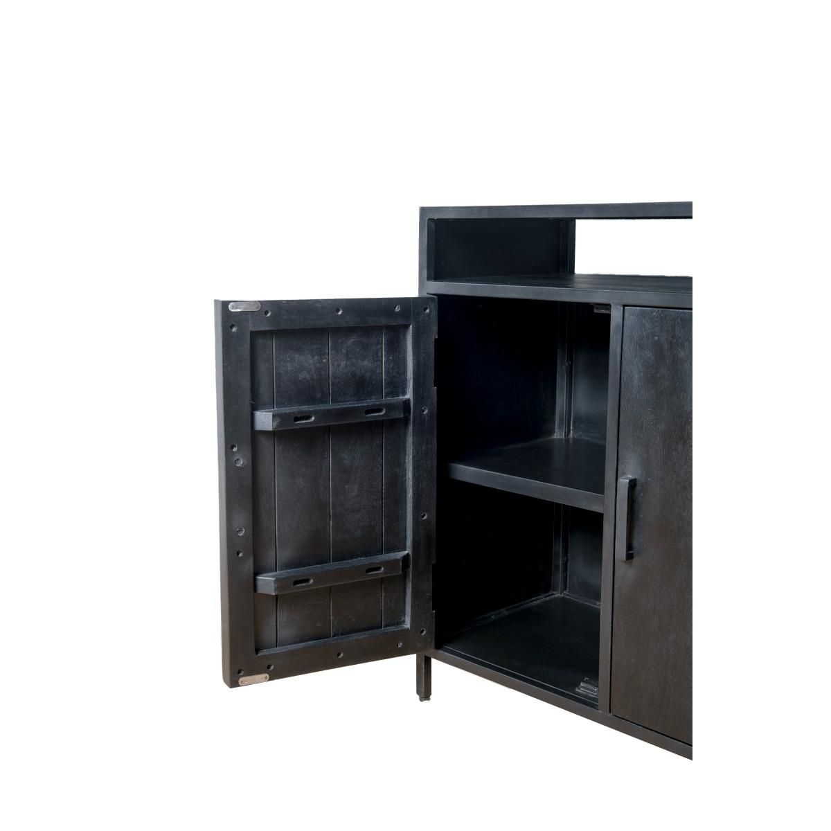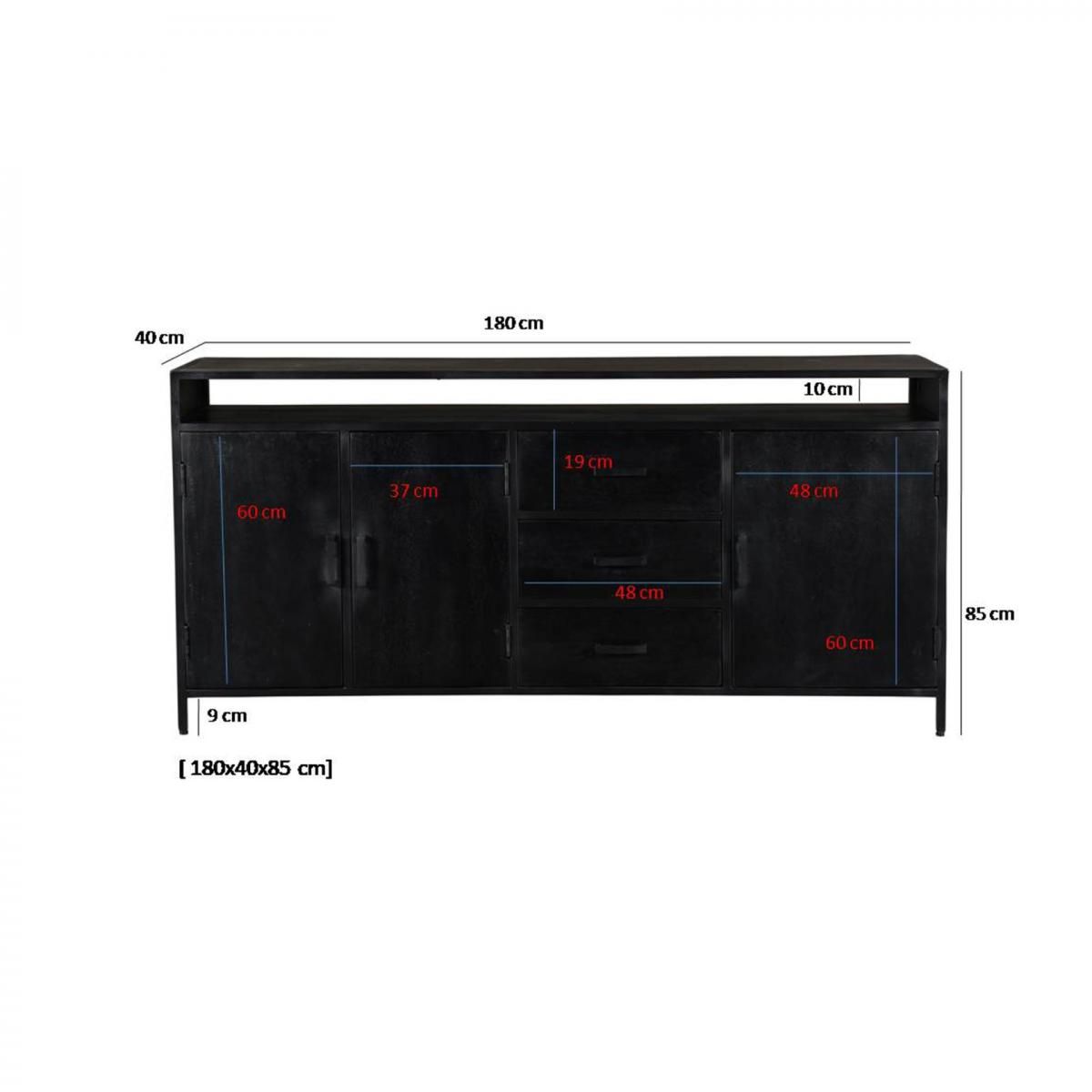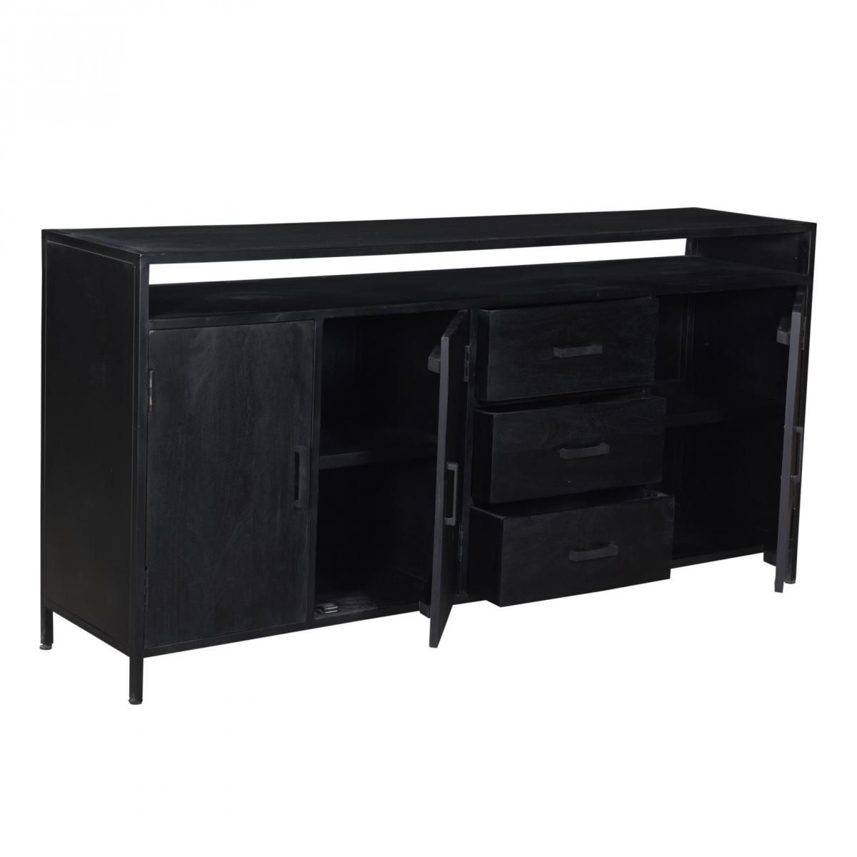 Creëer gemakkelijk één geheel in de woonkamer, eetkamer, (woon)keuken en hal met de gave meubelen uit de Kala meubelserie van het woonmerk Livingfurn! Dit dressoir heeft een afmeting van 180x40x85 cm en wordt gekenmerkt door zijn stoere en moderne uitstraling. Hij is uitgerust met een stevig zwart metalen frame, welke wordt afgewisseld met prachtige zwarte mangohouten delen. Dankzij de drie handige lades en de ruimtes achter de drie deurtjes, is er genoeg plek om spulletjes netjes uit het zicht op te bergen. Verder is dit meubel voorzien van een royaal open vak, waar bijvoorbeeld boeken of tijdschriften in neergelegd kunnen worden. Decoreer hem vervolgens met planten, beelden, vazen of foto's voor een persoonlijke touch. Dressoir Kala is ook verkrijgbaar in een kleiner formaat en past gemakkelijk in veel verschillende woonstijlen.