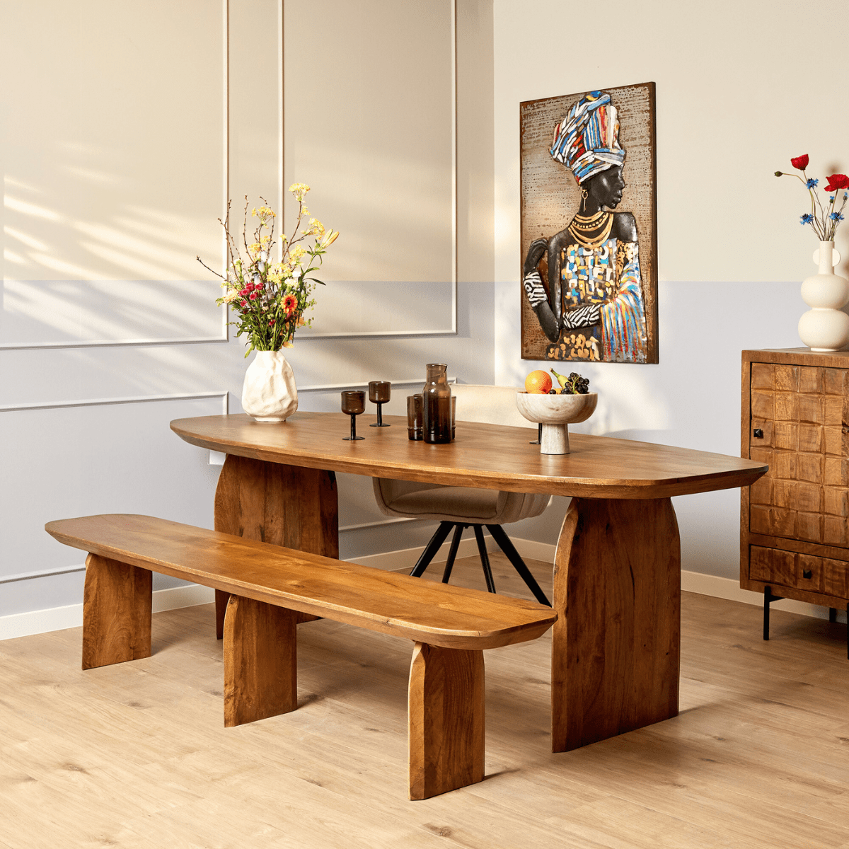 De tafel is volledig uitgevoerd in massief mango hout, wat een natuurlijke en warme uitstraling geeft. Het ontwerp is ovaal, wat een unieke en stijlvolle aanblik creëert.