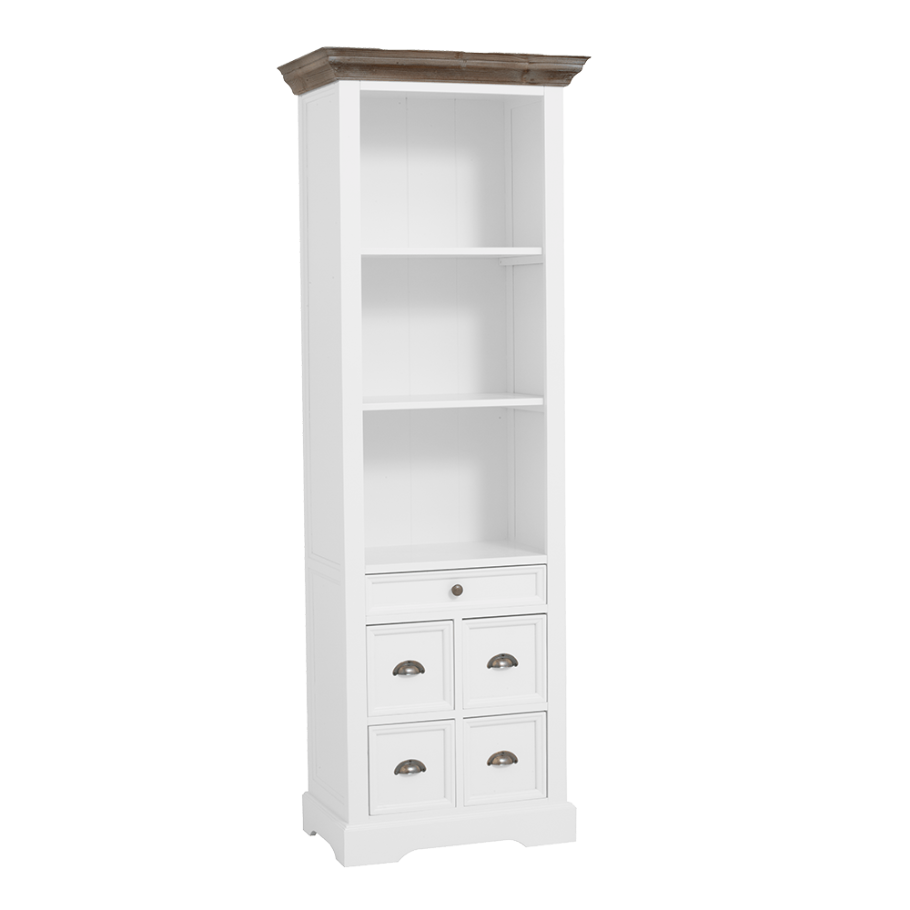 Deze kwaliteitsboekenkast is vervaardigd uit robuust grenenhout en afgewerkt in een helder wit (RAL9010) lak, wat zorgt voor een frisse en lichte uitstraling. Een bijzonder detail is het vergrijsde houten blad aan de bovenkant, dat een prachtig contrast vormt en de landelijke look versterkt. Met een breedte van 66 cm, een diepte van 40 cm en een hoogte van 191 cm biedt de kast voldoende ruimte met zowel open vakken voor decoratie als handige lades voor het opbergen van diverse spullen, waardoor orde en schoonheid samenkomen in één meubelstuk.