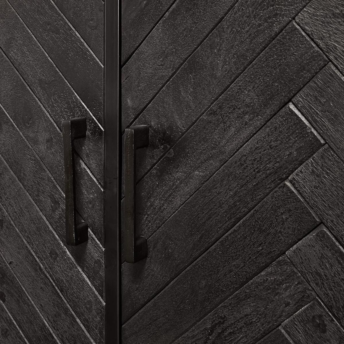 Het kabinet is afgewerkt met een zwarte lak en heeft een visgraatpatroon, wat het een chique en moderne uitstraling geeft. Het rustiek mangohout zorgt voor een natuurlijke charme, terwijl de metaalcomponenten een sterk en robuust gevoel creëren.