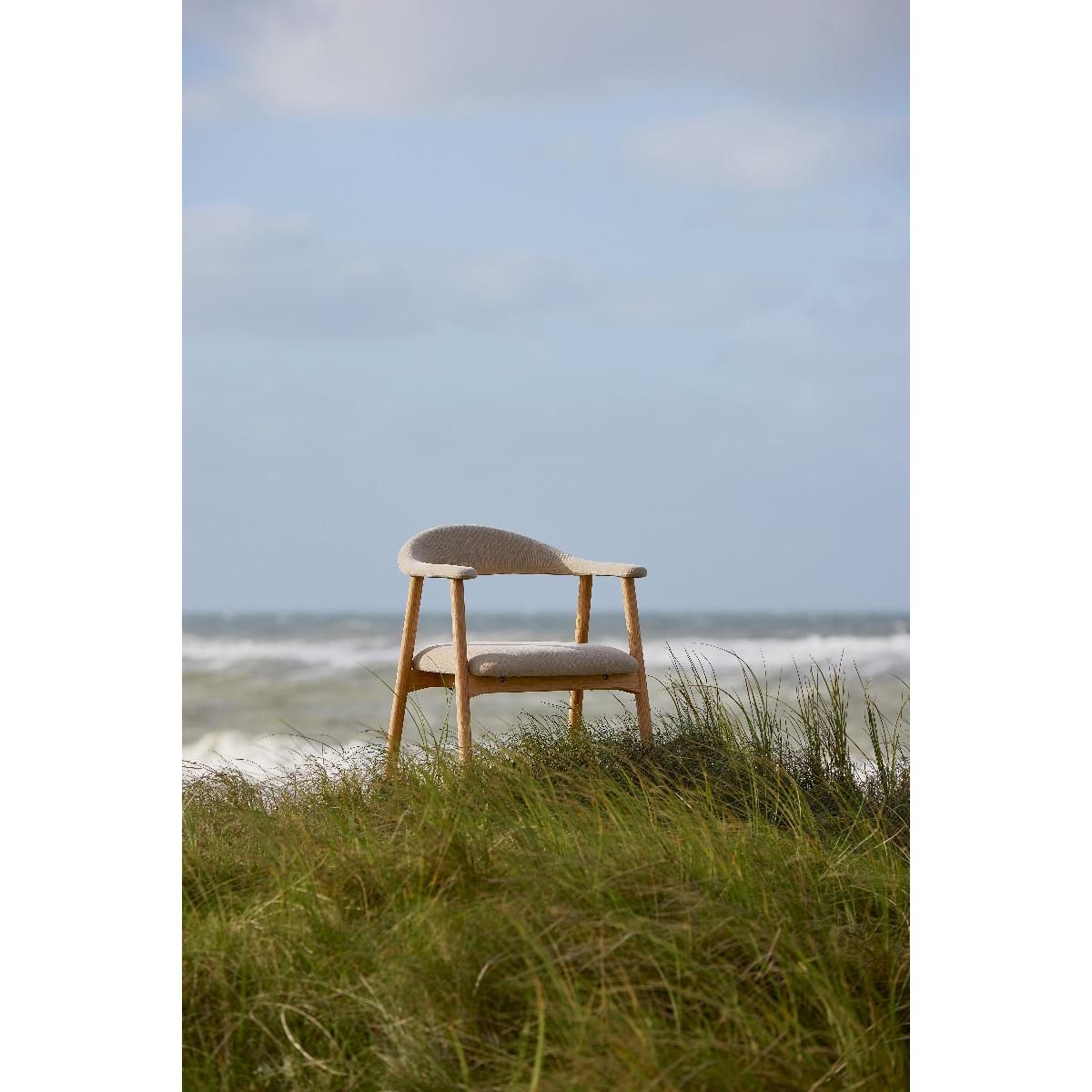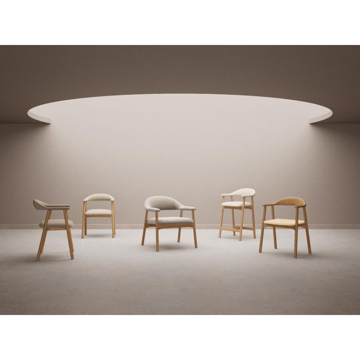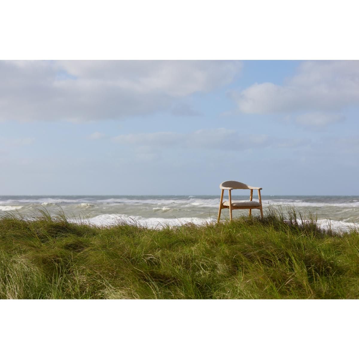 De Lykke armstoel wordt gekenmerkt door zijn lichte vormgeving en strakke esthetiek, wat zorgt voor een eigentijdse Scandinavische uitstraling. De armleuningen en open rug geven de stoel een luchtig en modern karakter. Het geoliede frame brengt warmte in de ruimte en creëert een uitnodigende sfeer. De zitting is bekleed met een zachte, chenille-achtige stof in een beige tint, wat de stoel een elegante en comfortabele afwerking geeft.