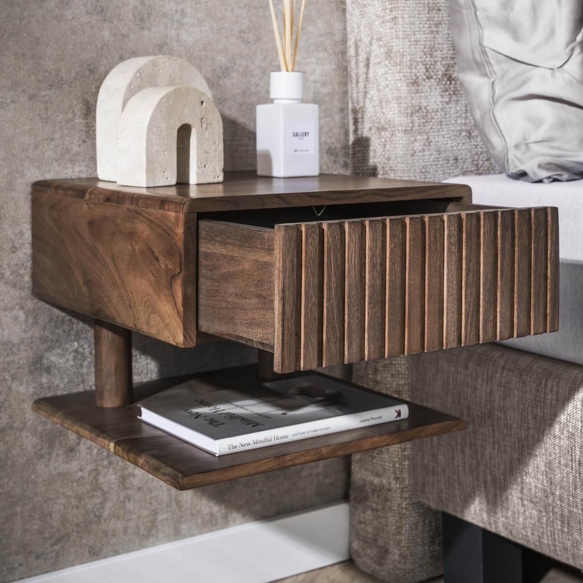 Het Marino zwevend nachtkastje brengt een warme, moderne uitstraling in je slaapkamer. Het nachtkastje is vervaardigd uit massief acaciahout en afgewerkt in een diepe drift brown tint, waardoor het natuurlijke karakter van het hout prachtig tot zijn recht komt. Door het zwevende ontwerp lijkt het kastje te zweven aan de muur, wat een licht en ruimtelijk effect geeft in elke kamer.