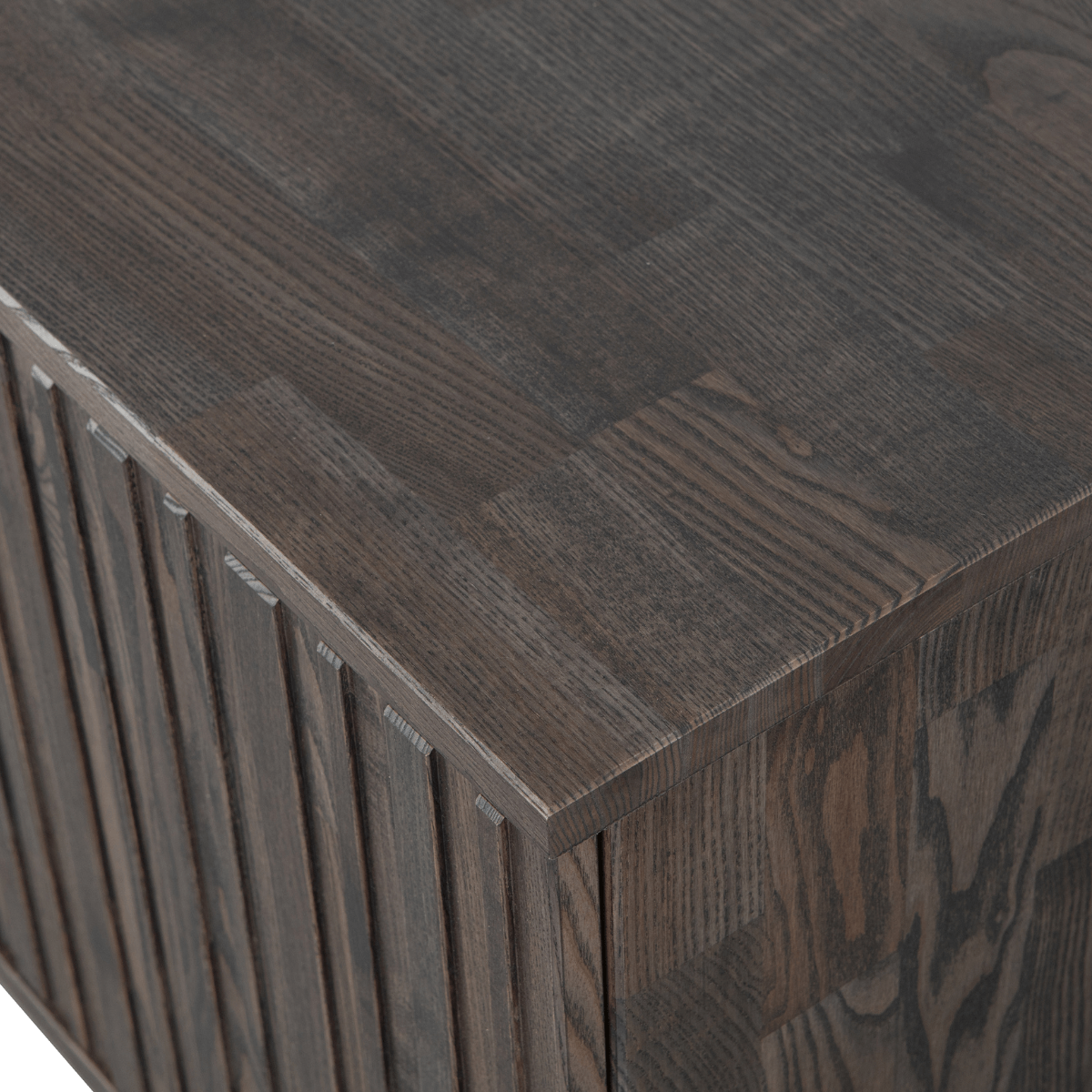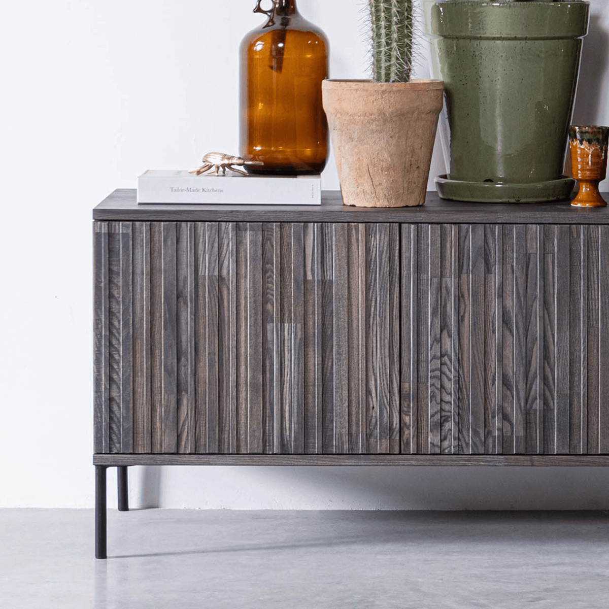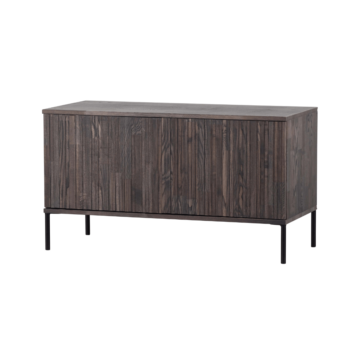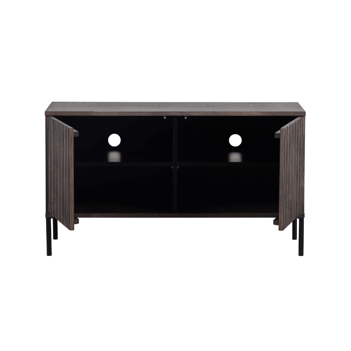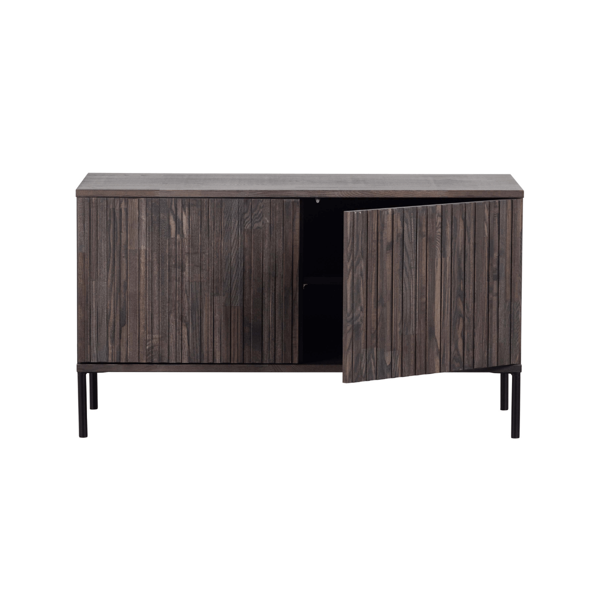 De geliefde Gravure-serie in een nieuw jasje. Deze New Gravure serie komt van het geliefde woonmerk WOOOD. Het verschil? Hij is nog iets royaler in formaat dan zijn voorganger. De meubels uit de New Gravure serie (espresso) zijn uitgevoerd in essen fineer. Essenhout is een iets zachte houtsoort met een strakke, rechte nerf. Elk meubel is uniek. De New Gravure serie bestaat uit een dressoir (200cm), een tv-meubel (100cm en 150cm) en een hoge kast. Combineer deze items voor eenheid binnen het interieur. Het kleine tv-meubel heeft een hoogte van 56cm, breedte van 100cm en een diepte van 44cm. Het meubel beschikt over twee uitneembare legplanken die tevens in hoogte verstelbaar zijn. Door de legplanken worden er vier vakken van 18x50x42 cm (hoogte x breedte x diepte) gecreëerd. De metalen poten zijn 15 cm hoog.