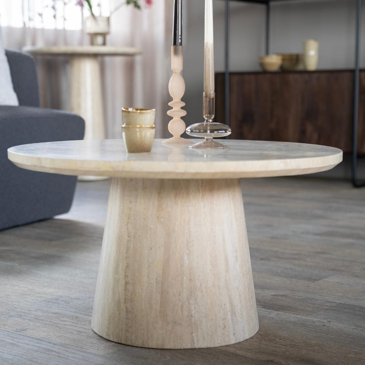 Plaats deze ronde salontafel in het midden van je zithoek om een centraal en functioneel element toe te voegen. Het robuuste travertin blad wordt ondersteund door een stevige poot, waardoor duurzaamheid hand in hand gaat met esthetiek.