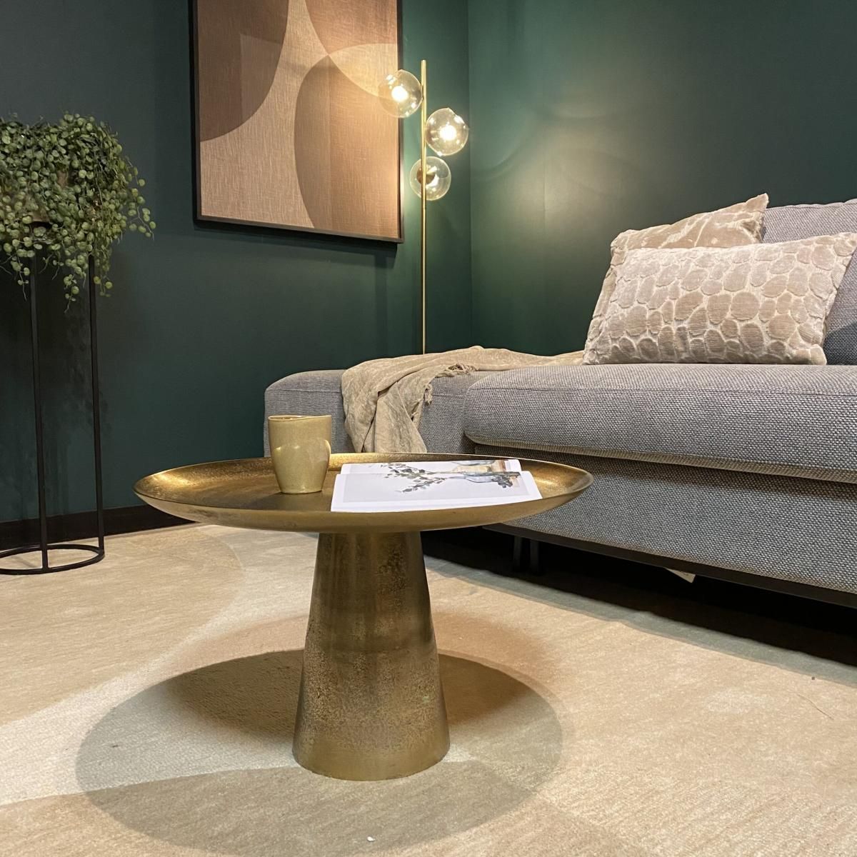 De Salontafel Daisy Large is een elegante en functionele toevoeging aan elke woonkamer. Gemaakt van aluminium, is de tafel afgewerkt met een antiek gouden finish.