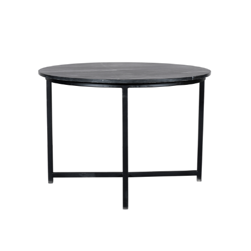 Het zwarte marmeren blad geeft deze salontafel een tijdloze en luxueuze uitstraling. Het metalen onderstel is bewerkt met een zwarte lak, wat een perfecte combinatie vormt met het marmeren blad.