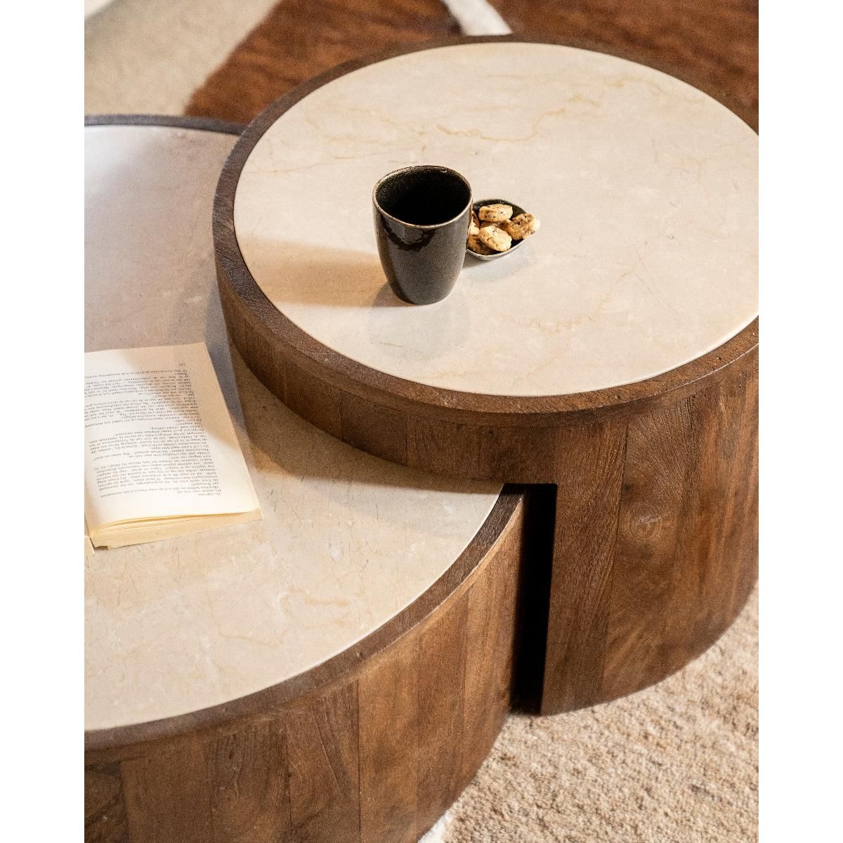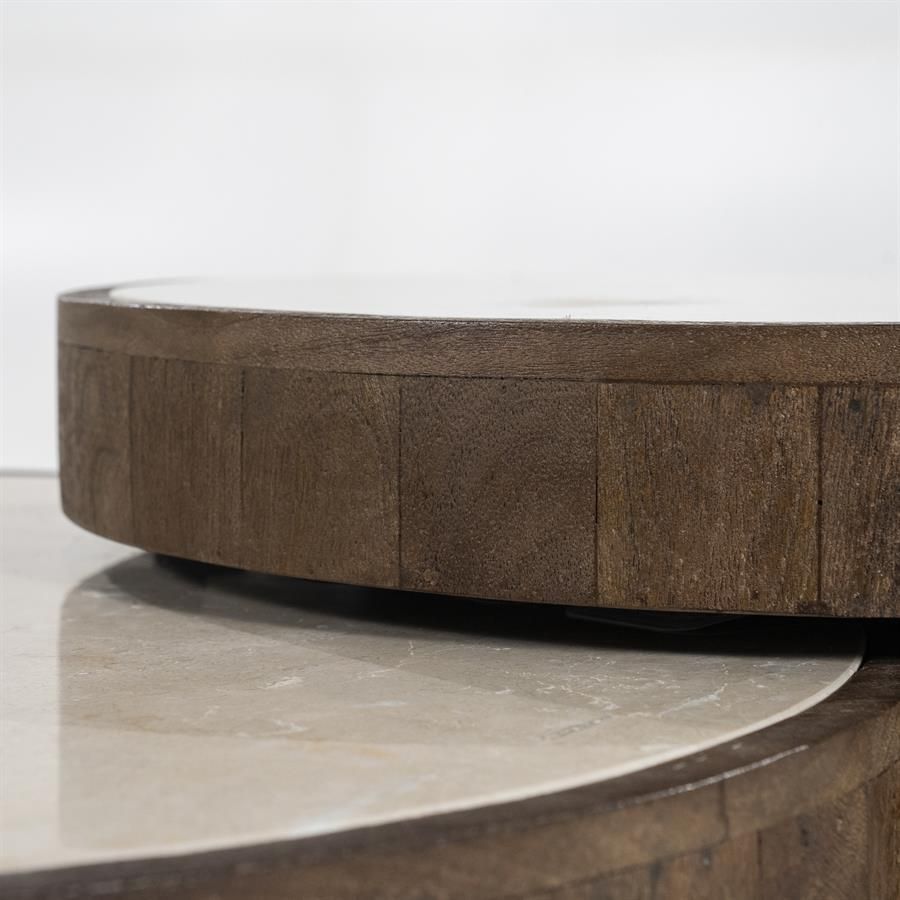 Elke tafel is uniek vanwege de natuurlijke variaties in het hout en het marmer, waardoor je een authentiek stuk in huis haalt. De set bestaat uit een grote en een kleine tafel, waardoor je ze apart kunt gebruiken of samen voor een gelaagde look.