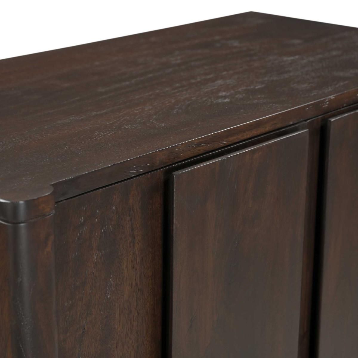 Kabinetkast Zana is gemaakt van mangohout in de kleur bruin. De deuren zijn voorzien van organische vormen die het meubel een eigentijdse en karaktervolle uitstraling geven. De compacte vorm en het strakke ontwerp maken dit kastje geschikt voor diverse ruimtes.